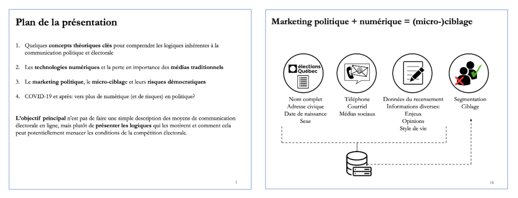 Ma présentation, intitulée Parler à tous… ceux qui comptent vraiment. La communication politique à l’ère numérique, avait pour objectif d’exposer les considérations stratégiques qui motivent les partis et leurs candidat.e.s à utiliser le numérique pour communiquer avec les électrices et électeurs, mais aussi d’aborder les conditions matérielles, logistiques et systémiques avec lesquelles ils composent. En bref, il s’agissait de montrer pourquoi et comment les campagnes politiques utilisent Internet et les médias sociaux pour créer et communiquer des messages partisans qui répondent aux intérêts et aux besoins de leurs cibles électorales.