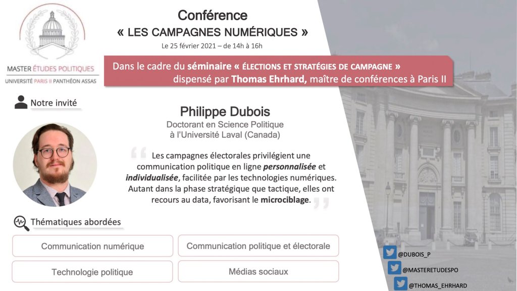 À l’invitation de Thomas Ehrhard (que je remercie!), j’ai participé à titre de conférencier au séminaire « Élections et stratégies de campagne » offert dans le cadre du Master Études Politiques.