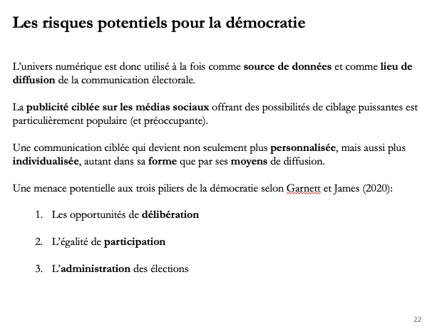 - Une introduction à la théorie du marketing politique comme paradigme dominant de la préparation et du déploiement des campagnes électorales, suivi de la présentation du micro-ciblage comme stratégie et comme tactique de communication (et ses risques démocratiques potentiels);