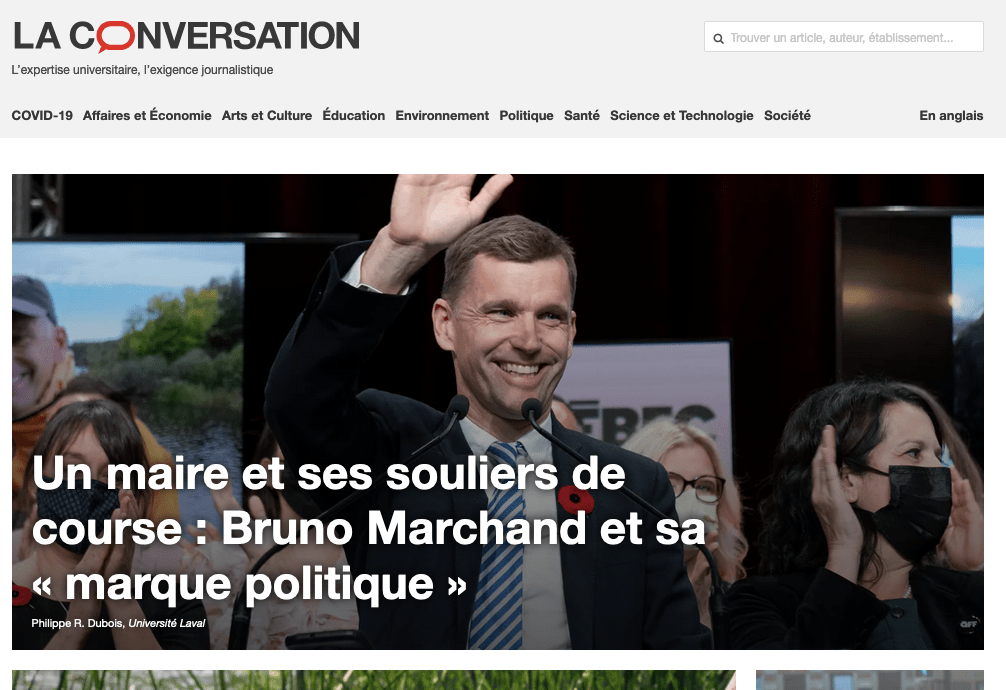 | Pour citer cette publication: Dubois, Philippe R. 2021. « Un maire et ses souliers de course : Bruno Marchand et sa « marque politique » », La Conversation, 24 novembre. Repéré à https://theconversation.com/un-maire-et-ses-souliers-de-course-bruno-marchand-et-sa-marque-politique-172126 |